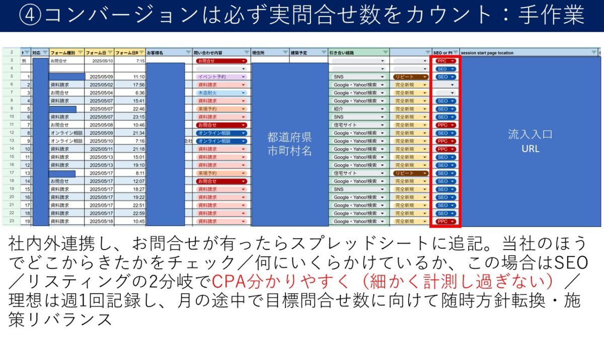 より精緻に費用対効果を検証する為に、社内外でのスプレッドシートを使った問合せ経路分析を行うのをお勧めてしています。