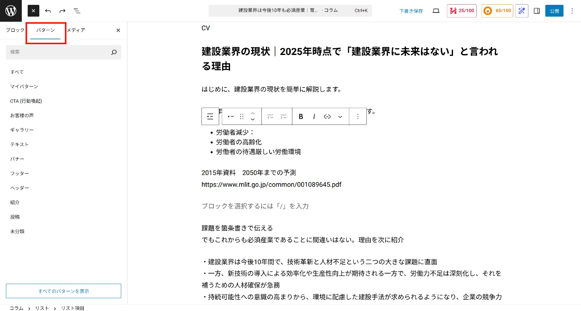 問い合わせボタン・施工事例ボタン 執筆メニューを「パターン」に切り替えると、以下ボタンが格納されています。適宜ご使用ください。 |